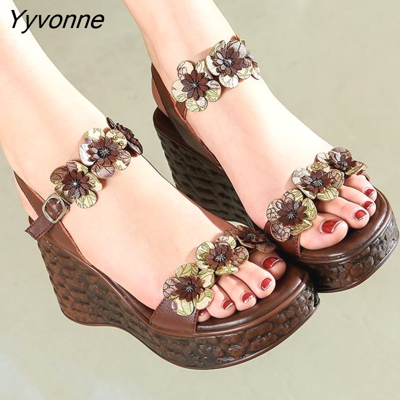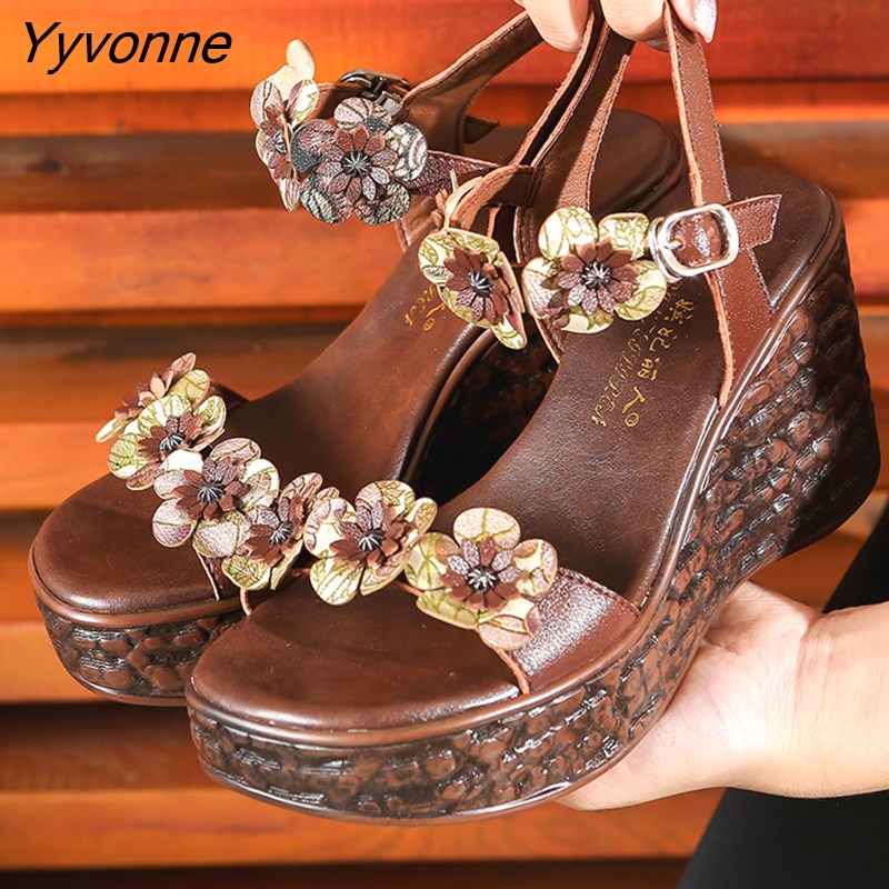 Yyvonne Genuine Leather Retro High Heels Sandals Women Shoes Buckle Strap 2023 New Spring Summer Wedges Lady Platform Sandals