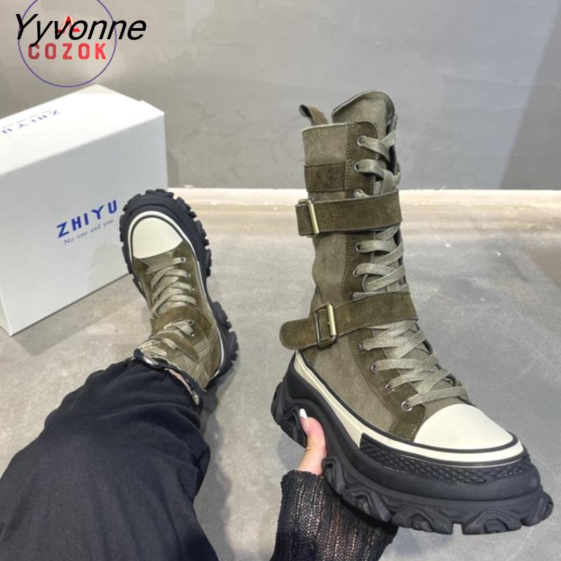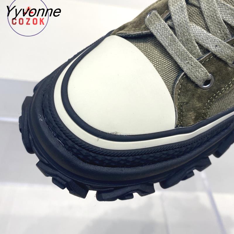 Yyvonne Women Boots Canvas Round Toe Mid Heel Boots for Woman Fashion Platform Lace Up Shoes  Women's Combat BootsBotas Mujer Size 35-40