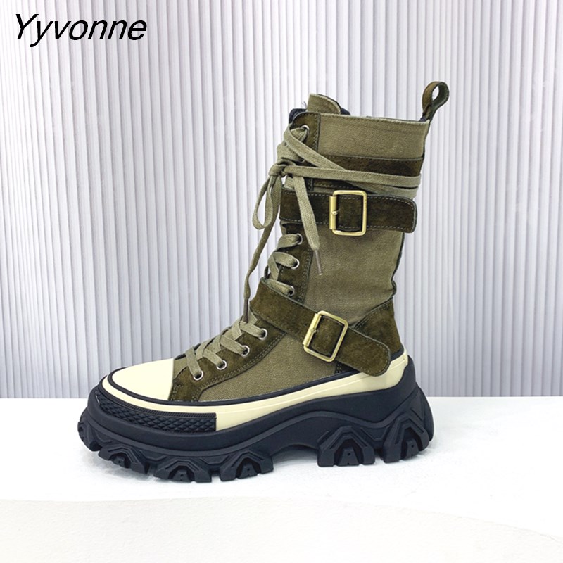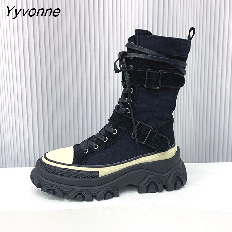 Yyvonne Women Boots Canvas Round Toe Mid Heel Boots for Woman Fashion Platform Lace Up Shoes Women's Combat BootsBotas Mujer Size 35-40