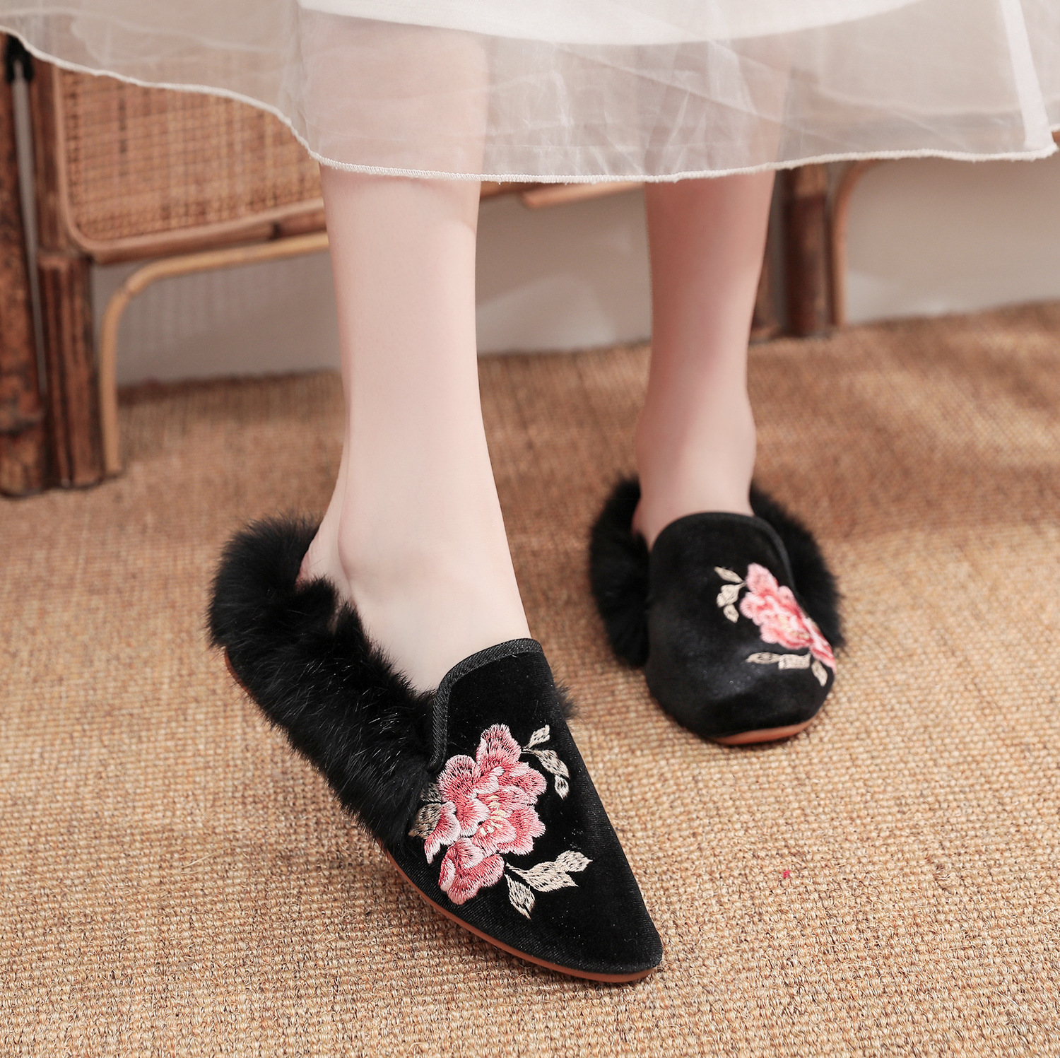 Yyvonne Yyvonne Women's Slippers Wear Wool Shoes New Embroidered Home Outdoor Fashion Golden Velvet Women's Shoes Half Slippers