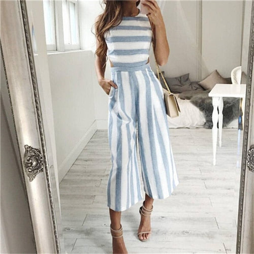 2018 Women's Sleeveless Striped Jumpsuit Casual Loose Trousers Fashionable Leotard Catsuit Combinaison Wide Leg Pants