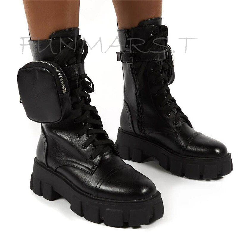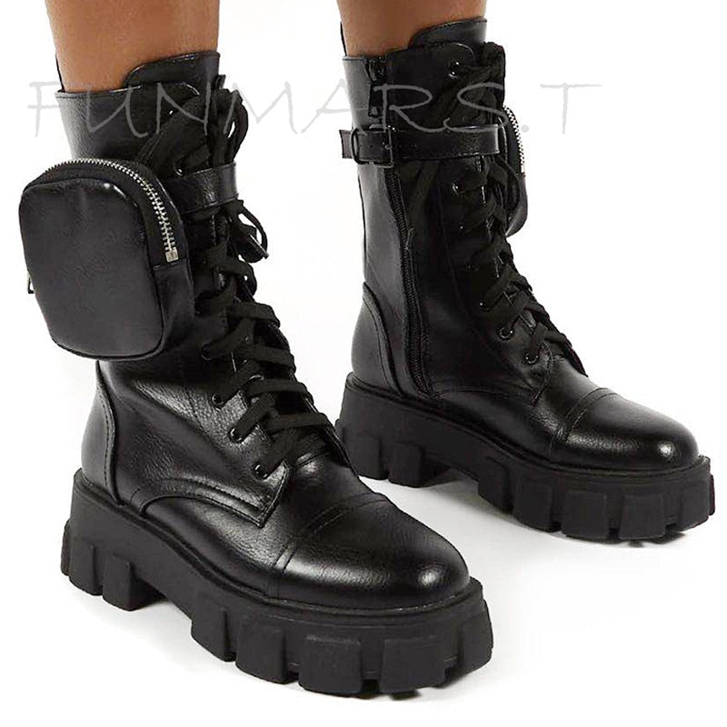 2020 New Chunky Boots Fashion Pocket Platform Boots Women Ankle Boots Female Sole Pouch Motorcycle Boots Shoes Women Botas Mujer