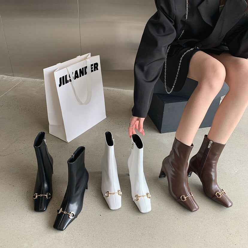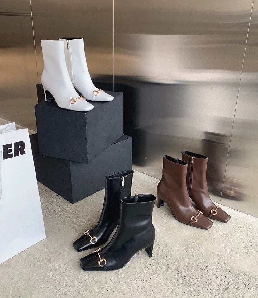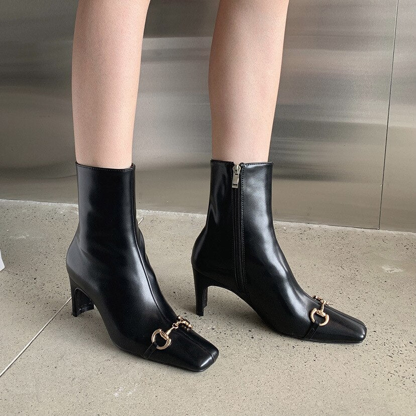 2021 Autumn Winter New Horsebit Square Head Women's Straight Boots Female South Short Boots Thick Heel High Heels Martin Boots