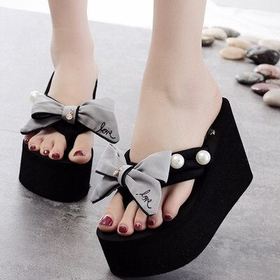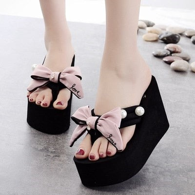 2021 Bowknot Heeled Flip Flops Women Slippers Summer 11CM High Heels Wedge Platform Shoes Sweet Womens Beach Slippers