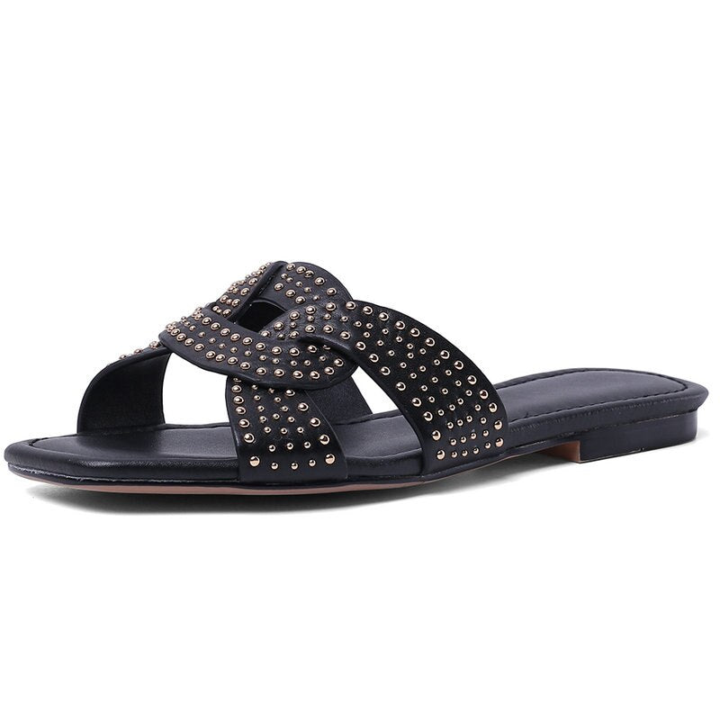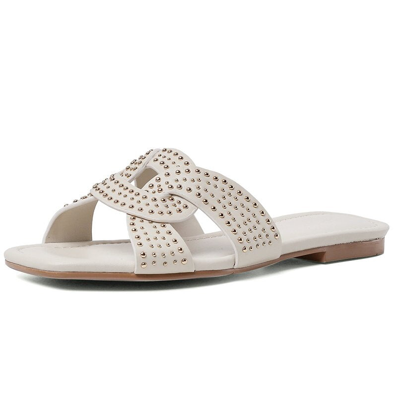 2021 New Genuine Leather flats Slippers Brand Design Elegant Square Toe 1cm Heel Women Shoes Ladies Summer Outdoor Beach Shoes