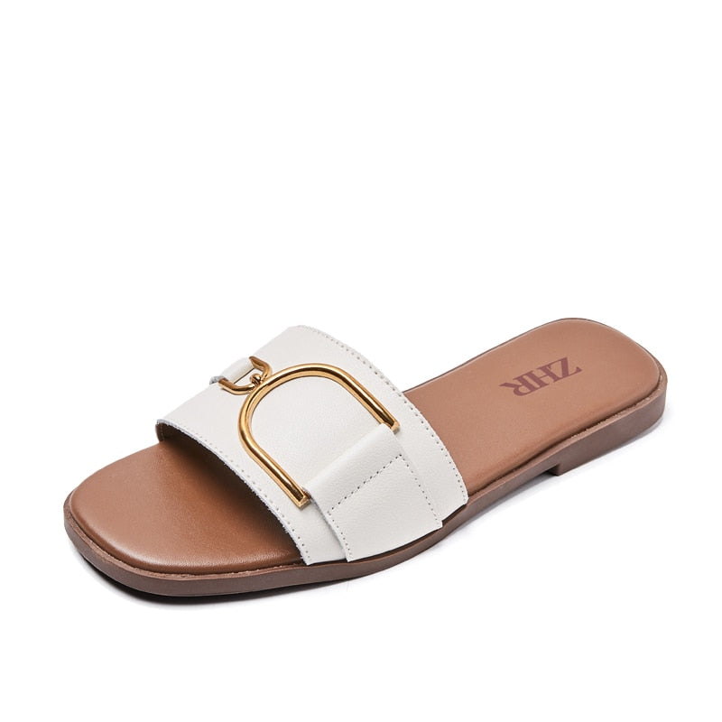 2021 Slippers Women Slides Luxury Brand Flip Flops Shoes Genuine Leather Square Toe Summer Slide Designers Sandals Casual Flats