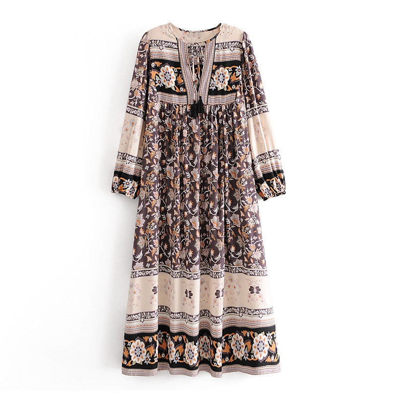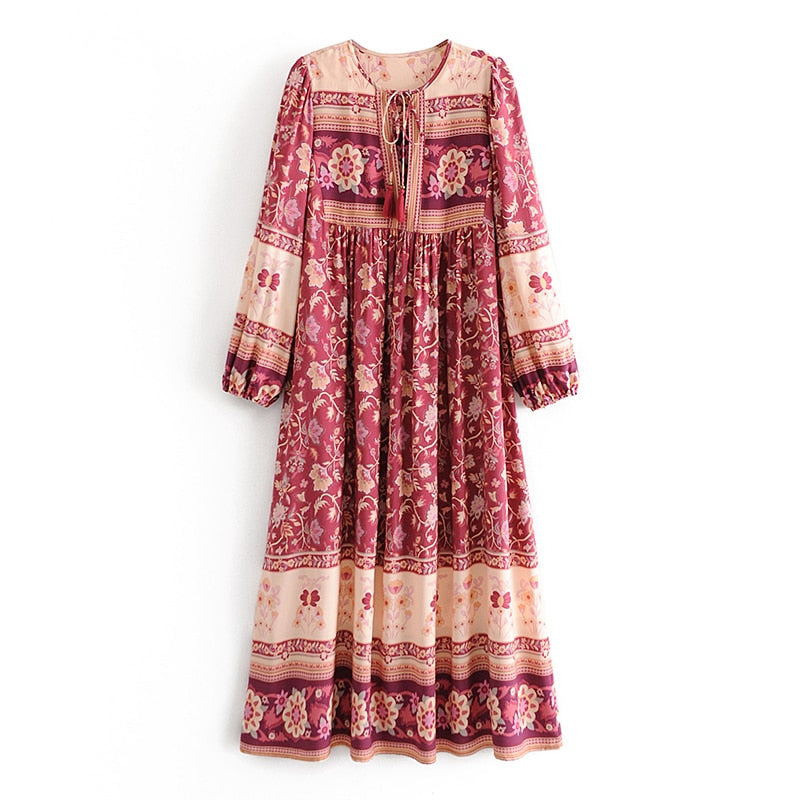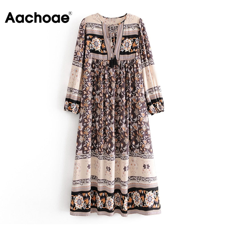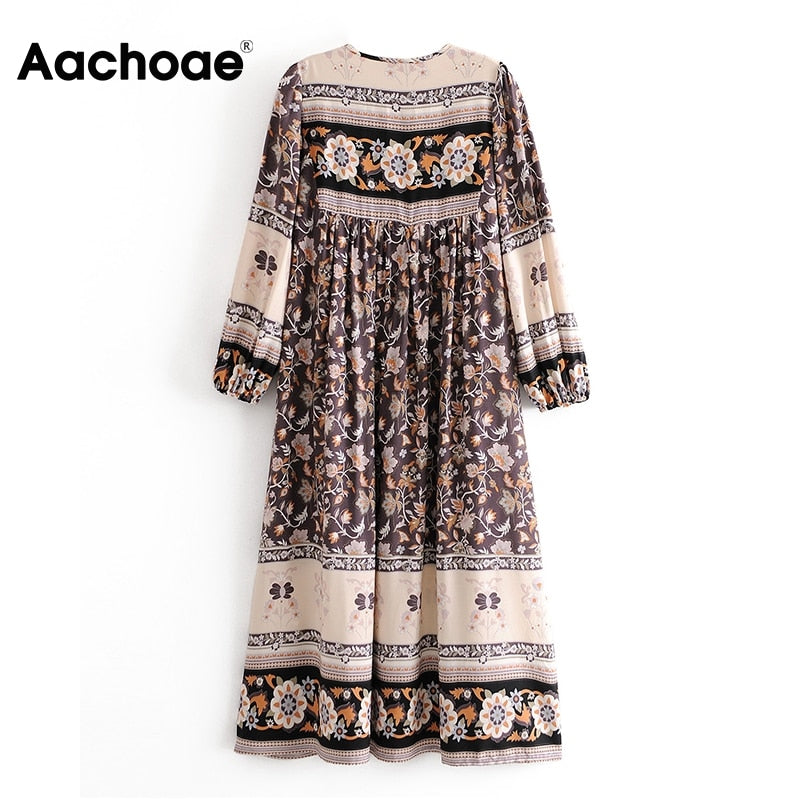 Aachoae Vintage Printed Midi Dress Women Bow Tie Hollow Out Loose Dresses 2021 Long Sleeve O-neck Boho Dress Vestidos Mujer