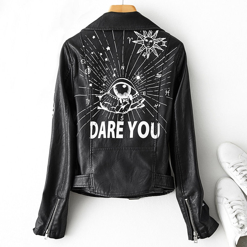 Ailegogo Spring Autumn Women Graffiti Print Pu Faux Leather Jacket with Belt Streetwear Female Moto Biker Rivet Coat Outwear