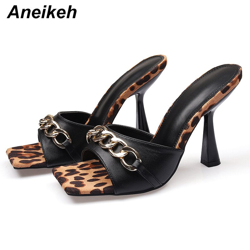 Aneikeh Fashion Femmes Chaussures Serpentine Metal Decoratio High Heels Square Toe Shallow PU Patchwork 2021 Summer Women Shoes