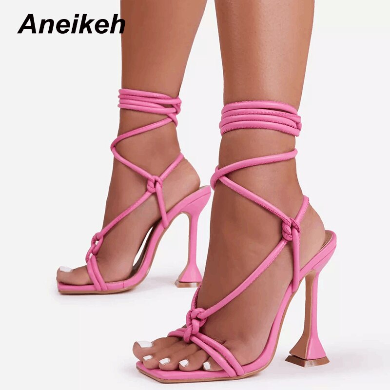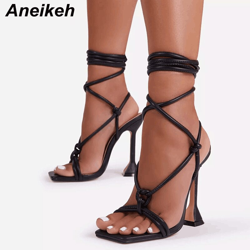 Aneikeh Women's Shoes Cross-Tied Head Peep Toe Patchwork Fashion High Heels Wedding  Sandalias Mujer NEW 2021 Summer Narrow Band