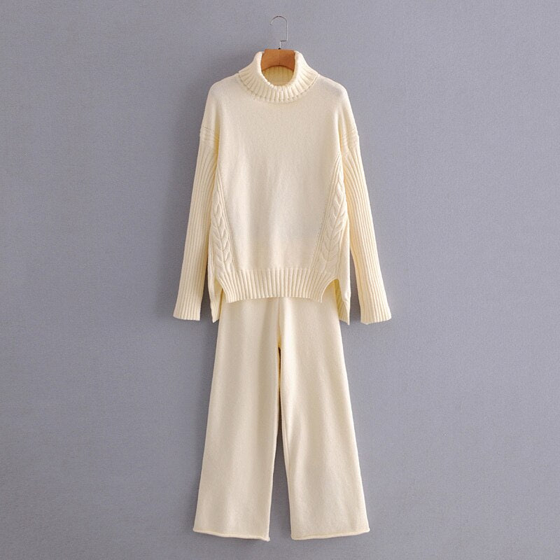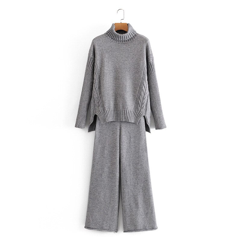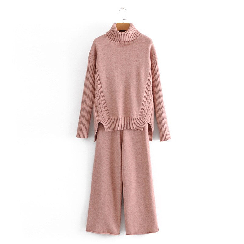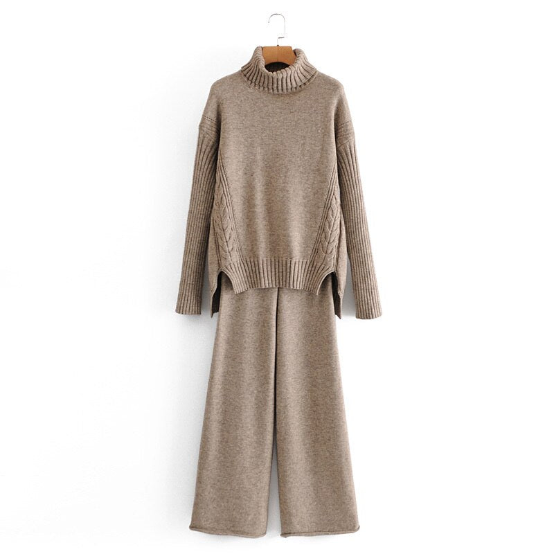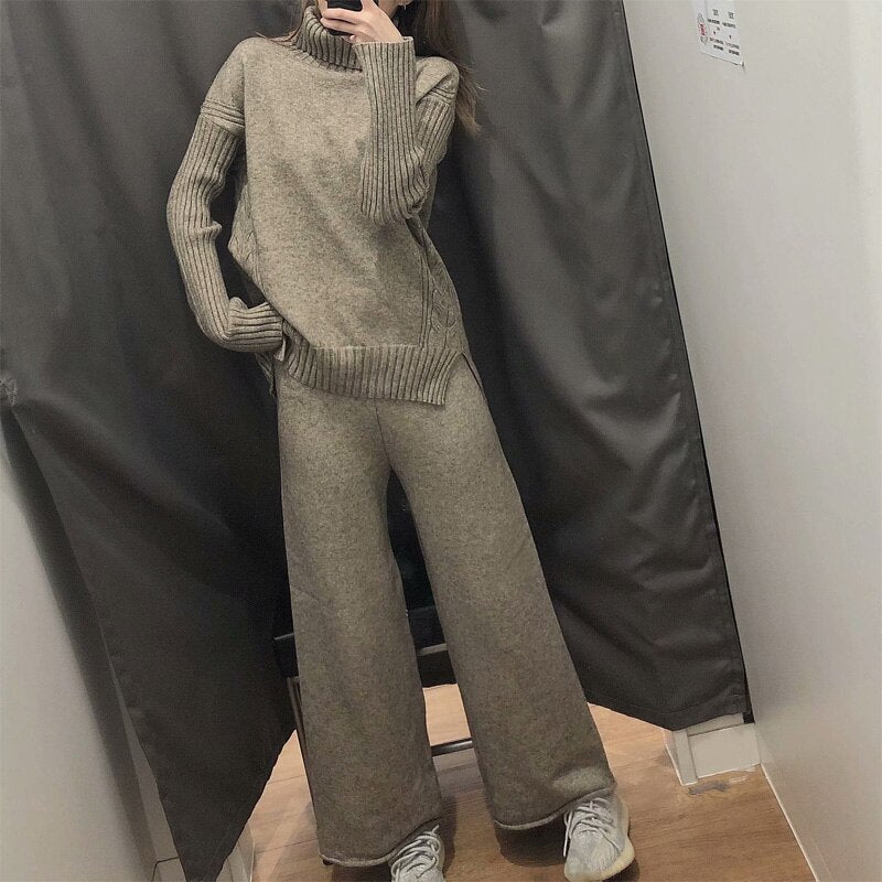 Autumn and winter women's suit casual solid color high neck long sleeve loose sweater + knitted wide leg pants suit