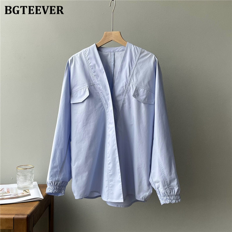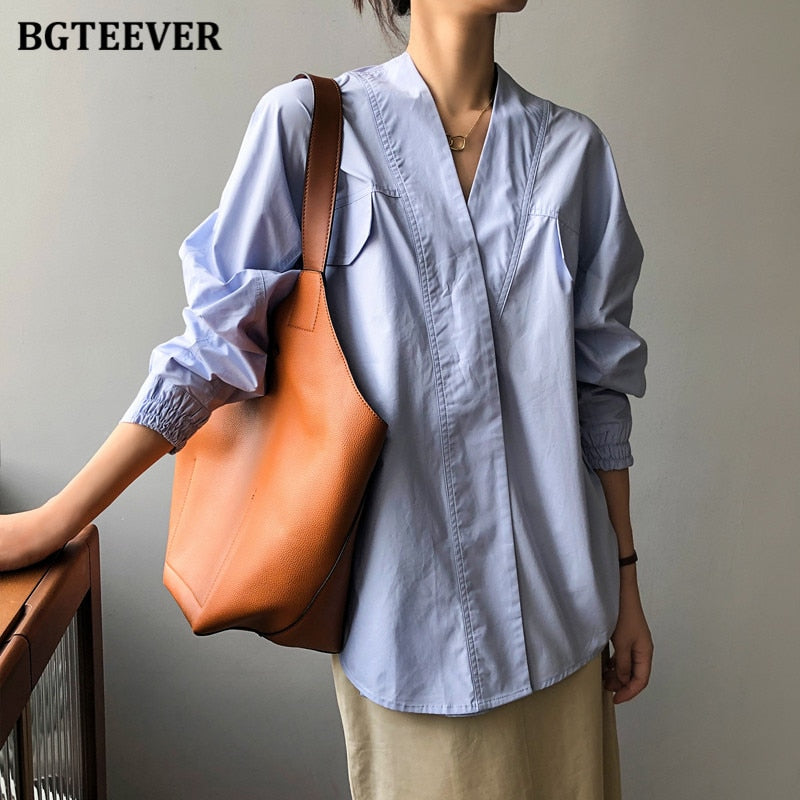 BGTEEVER Casual Oversized Solid Women Blouses Shirts V-neck Full Sleeve Loose Female Tops Shirts 2021 Autumn Ladies Blusas