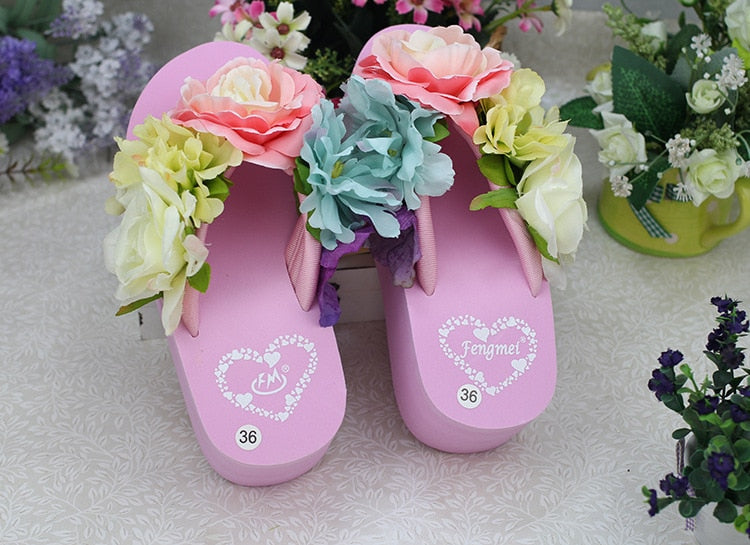 Bohemia Flowers Woman Beach Flip Flops Summer Style Slides Resistant Slippers Platform Shoes Woman Hit Color Wedges Slippers