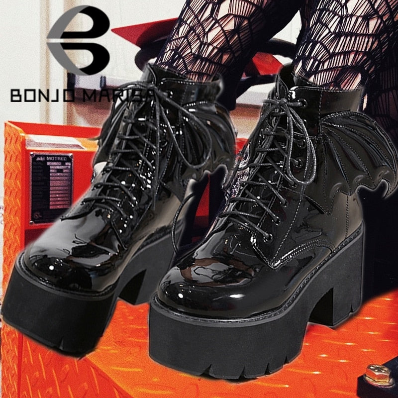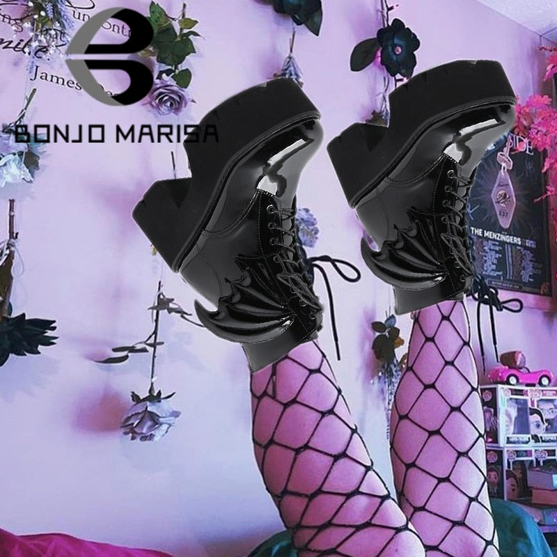 BONJOMARISA 2021 Brand Platform Chunky Heel Bat Wing Lace Up Zipper Goth Black Punk Cool women's Boots Street Black Ankle Boots