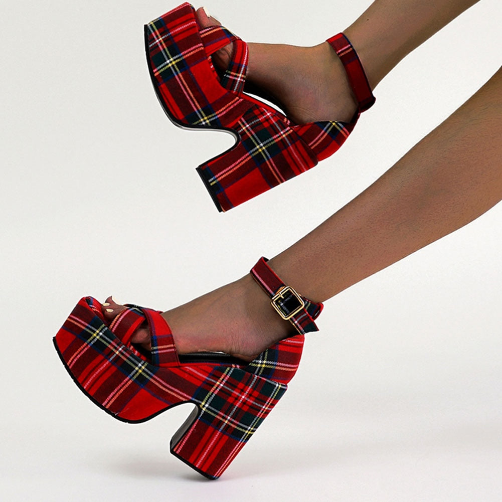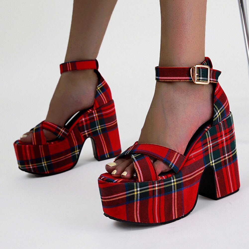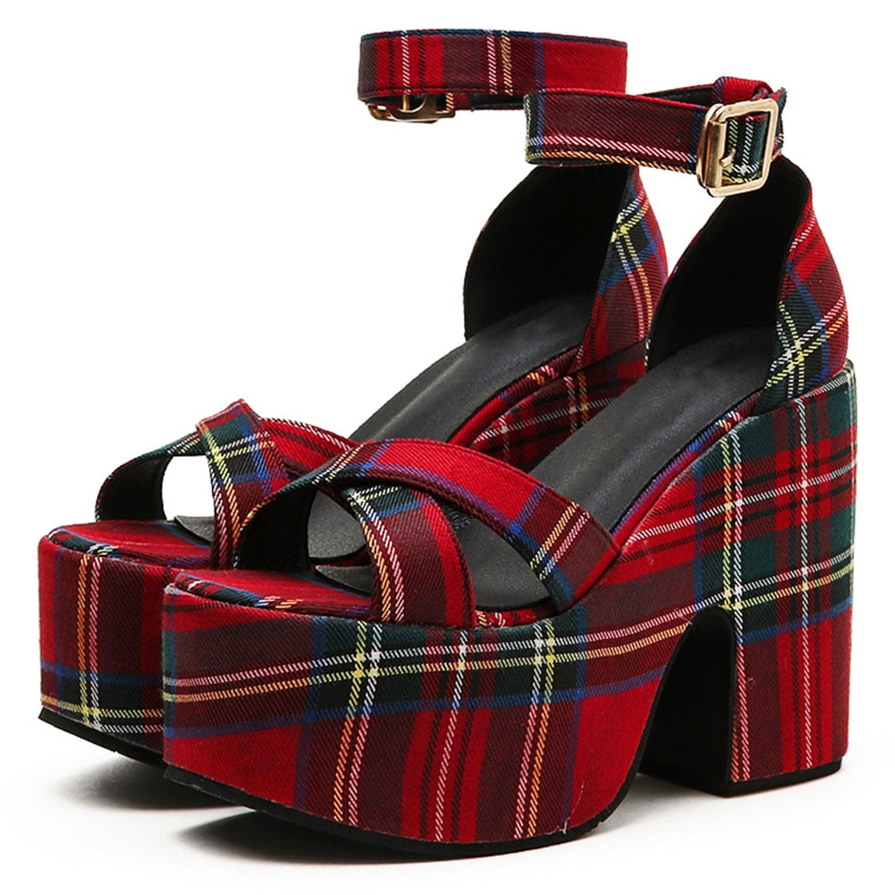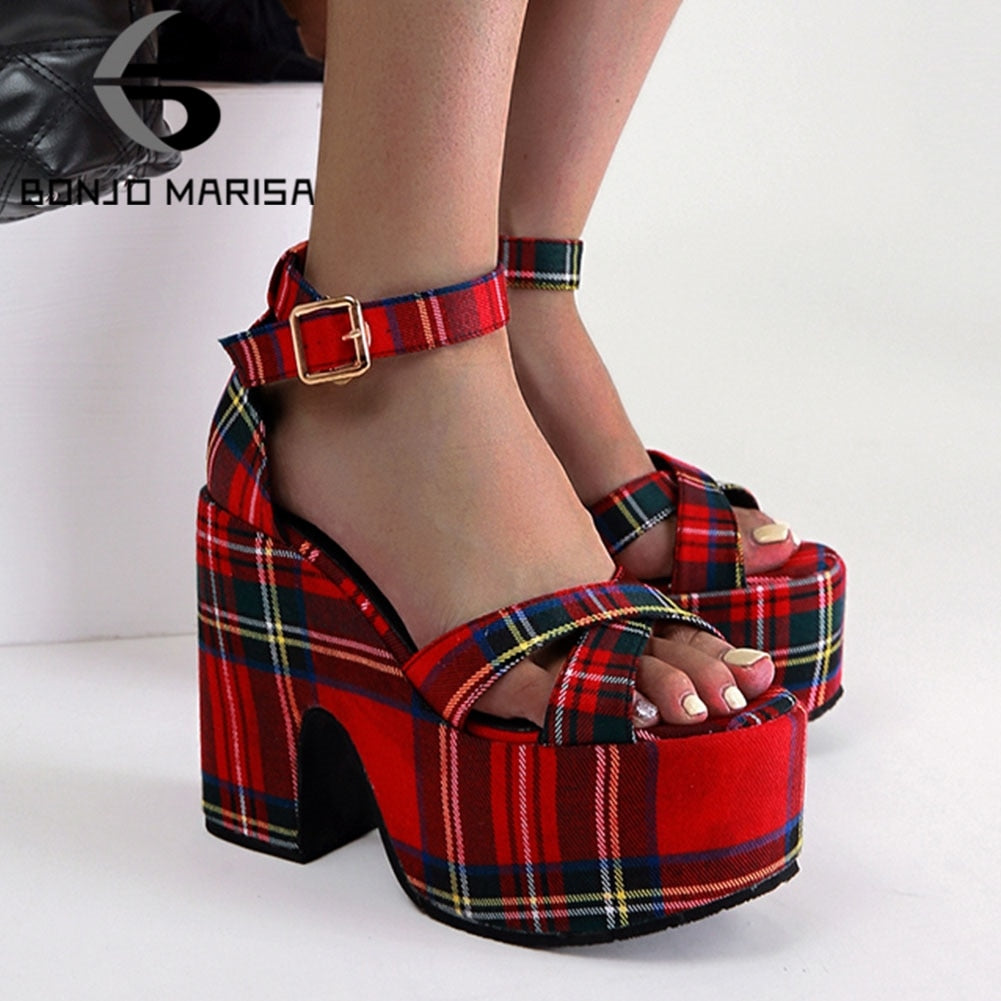 BONJOMARISA Big Size 43 Peep Toe Plaid Red Platform Chunky high-heeled women's Sandals Summer Punk Party Dress Round Toe Shoes