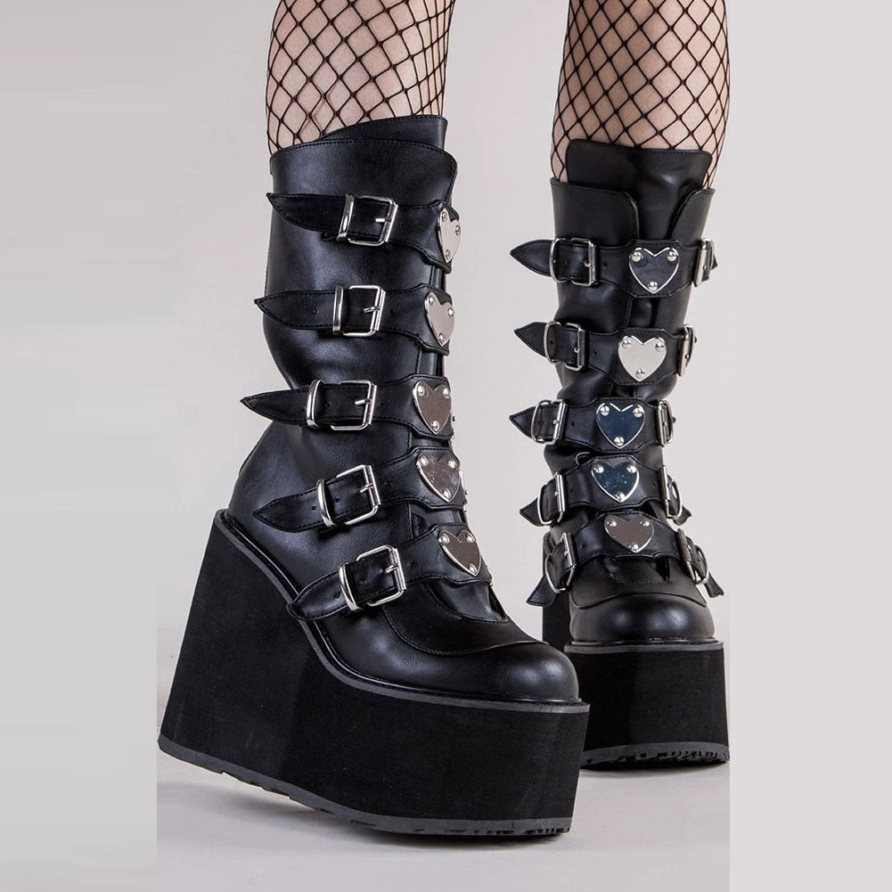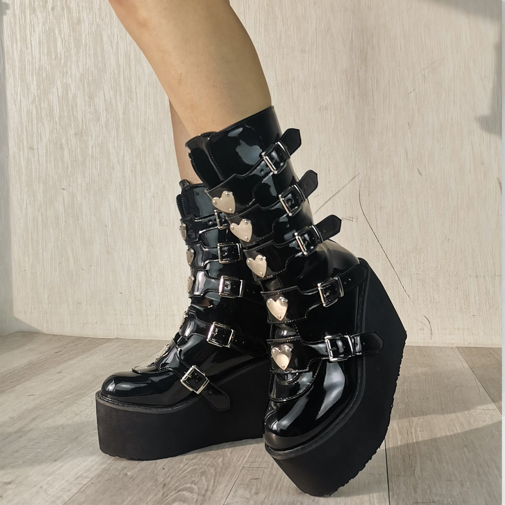 BONJOMARISA Brand Goth Love Heart Buckle Punk Wedges Platforms Women Boots Zipper Black Cosplay Cool Street Autumn Ladies Shoes