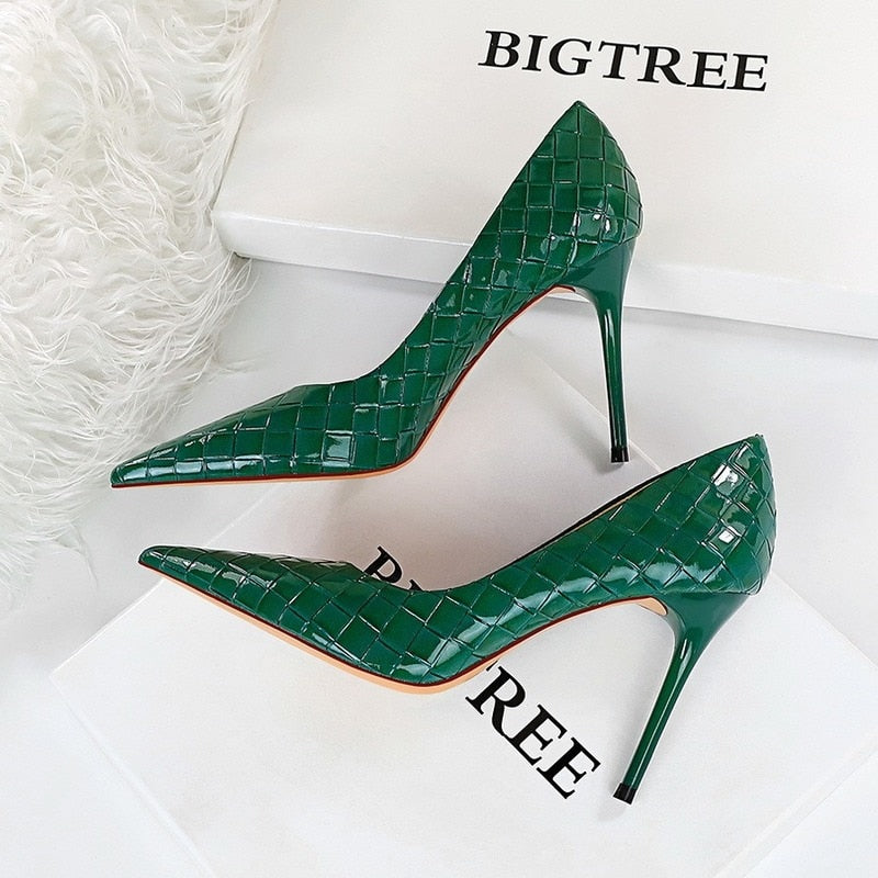 Brand Luxury Women's Green High Heels Shoes Sexy Party Braided Pumps Ladies Fashion Leather Shoes Wave Plus Size Office Career