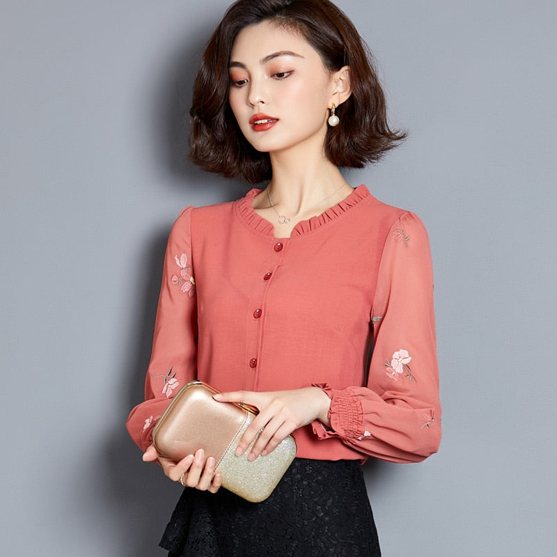 Clothing Women 2021 Plus Size 4XL Long Sleeve Women's Blouses Printed Solid Color Shirt Chiffon Blouse Ladies Tops 5 Color 2640