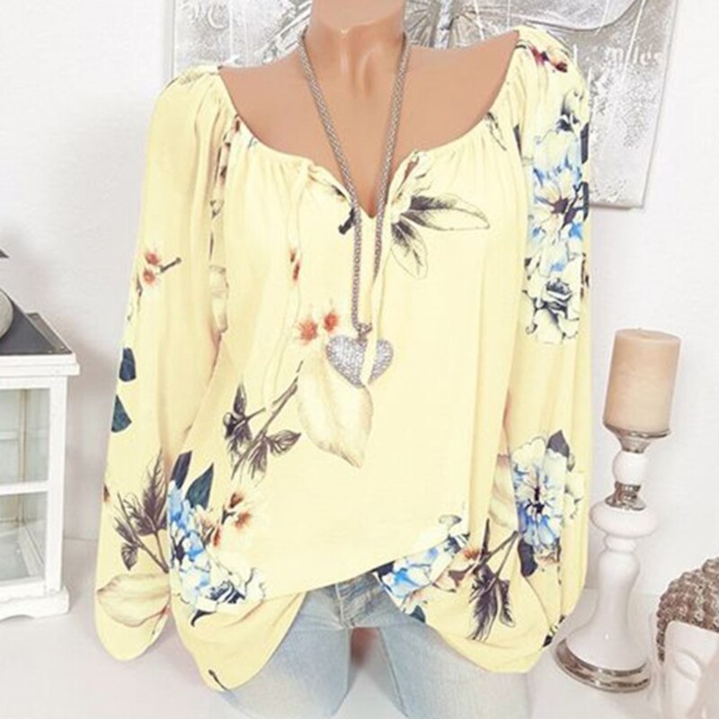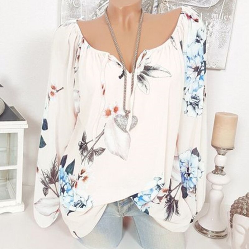 Fashion Floral Print Women Blouse Trendy Long Sleeve Blouse Tops Lace Up Plus Size Off Shoulder Shirts