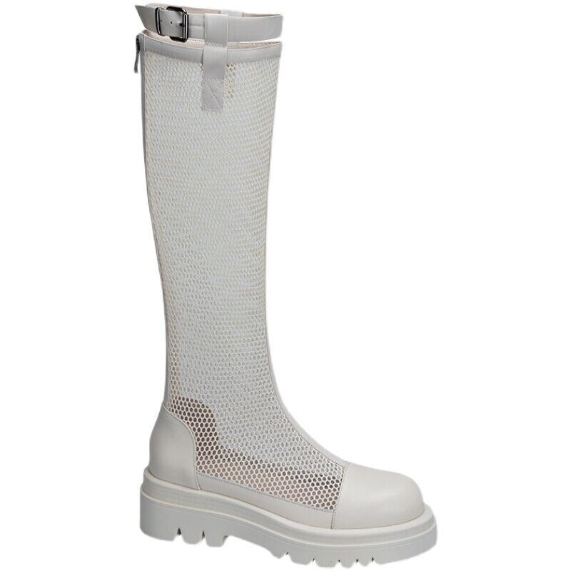 Fashion Knee-High Sandals Boots Hollow Out Mesh High Heels Party Shoes Woman Round Toe back Zipper cool boots Mujer Black pumps