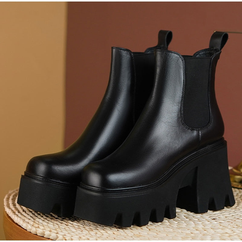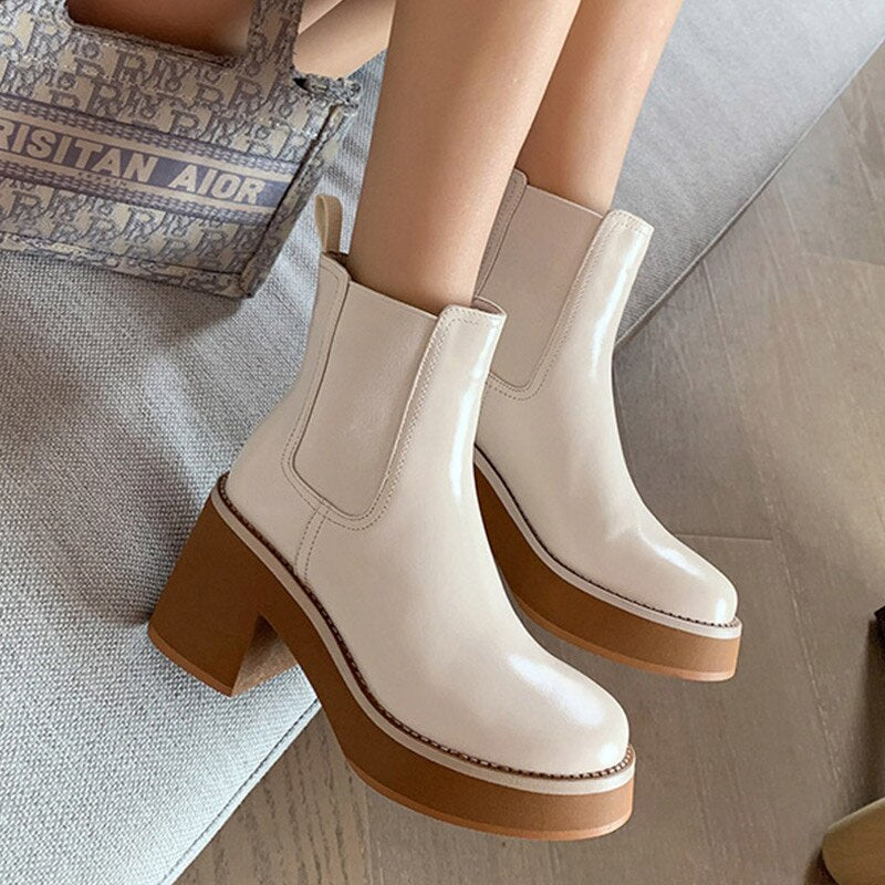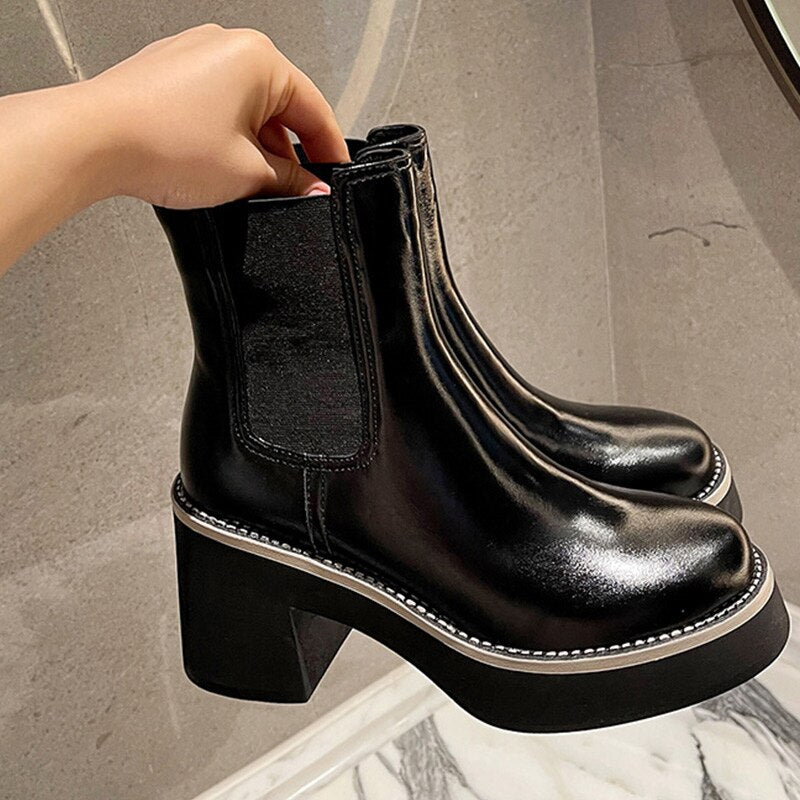 Fashion Platform Chelsea Boots For Women Chunky Heels Ladies Leather Shoes Autumn Winter Slip On Square Toe Female Ankle Boots