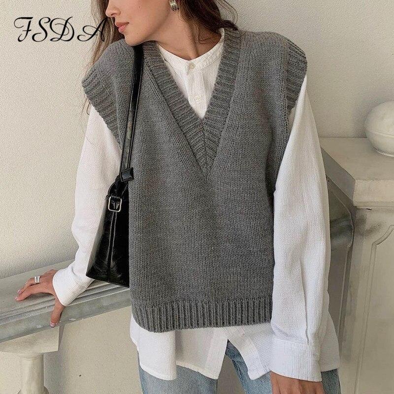 FSDA V Neck Knitted Vest Sweater Sleeveless Women Khaki Casual Pullover Black 2020 Autumn Winter Gray Jumper Fashion 1026-1