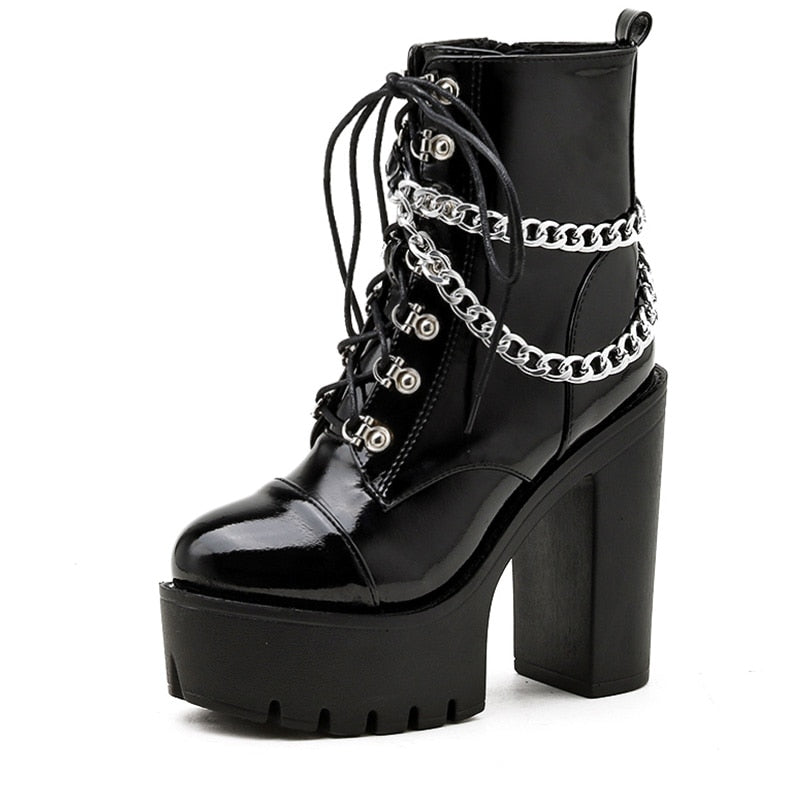 Gdgydh Black Gothic Women Shoes Autumn Ladies Ankle Boots High Heels Sexy Chain Punk Style Patent Leather Boots For Party Zipper