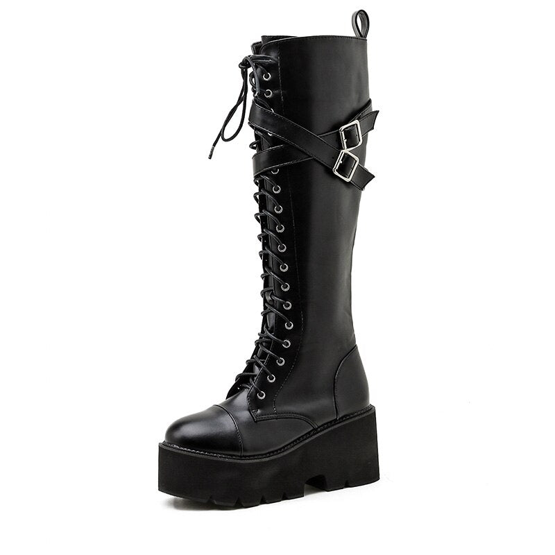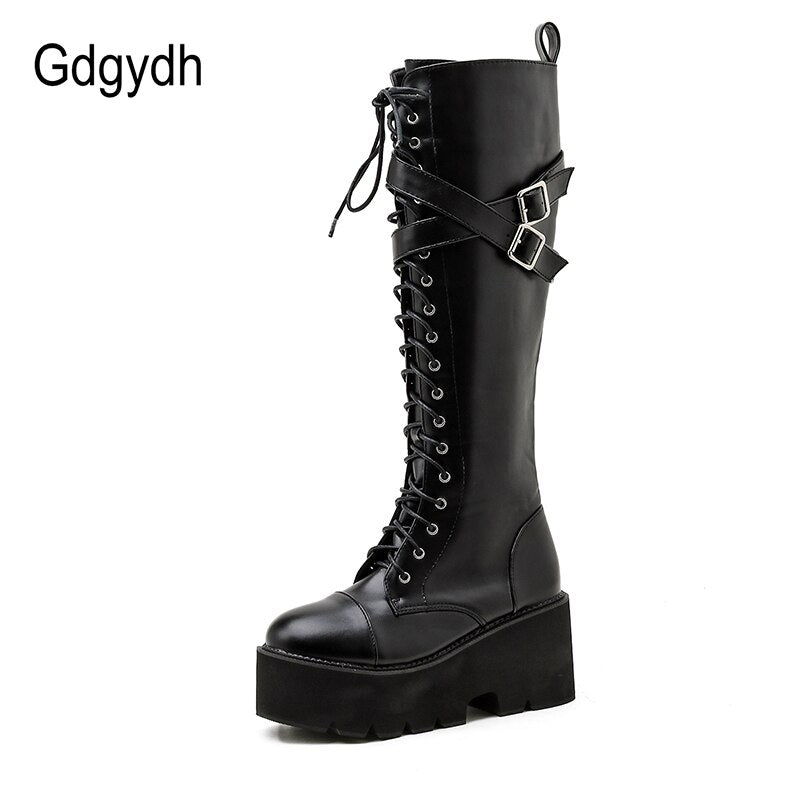 Gdgydh Fashion Women Boots Cross Strap PU Leather Autumn Winter Knee High Boots Ladies Thick Sole Platform Shoes Punk Gothic