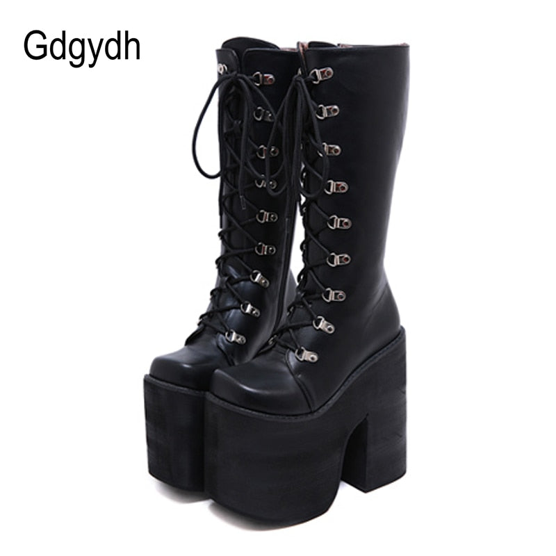 Gdgydh Large Size 43 Thick Platform Extreme High Heels 17cm Cool Motorcycles Boots Punk Style Shoelaces Knee High Boots Winter