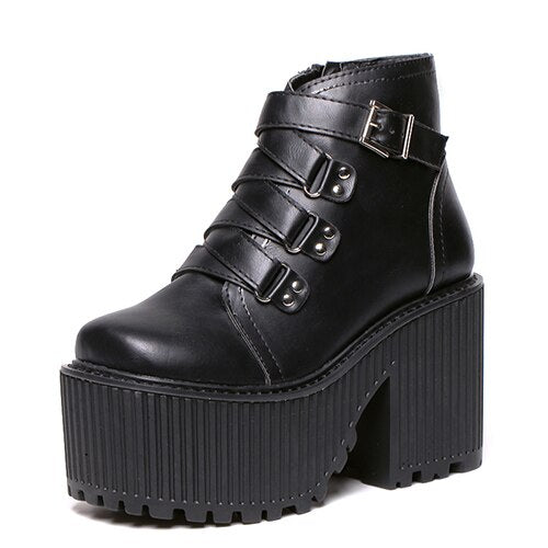 Gdgydh Leather Round Toe High Heel Boots Women Shoes Buckle Rubber Sole Black Platform Shoes Autumn Ankle Boots Punk Shoes Cool