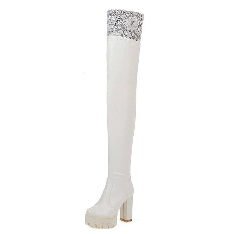 Gdgydh Sexy Lace Thigh High Boots For Plus Size Women Platform Shoes Over The Knee Boots Stretch Fabric Black Leather Winter New