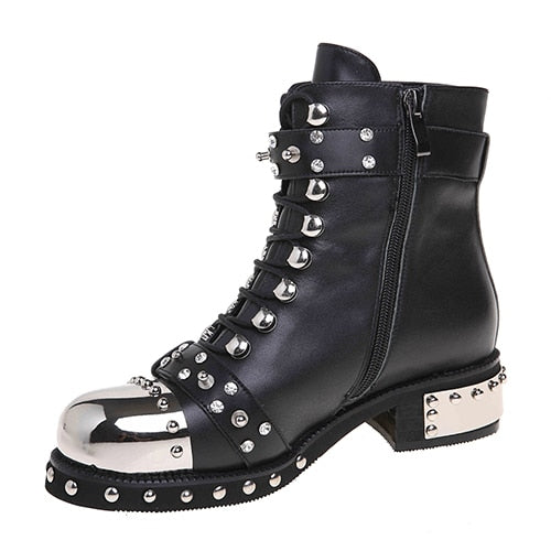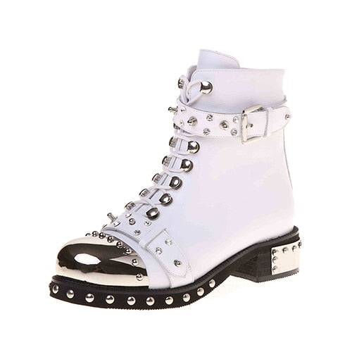 Gdgydh Sexy Rivets Womens Ankle Boots Genuine Leather Chunky Heel Ladies Lace Up Goth Punk Platform Shoes Boots Spring Big Size