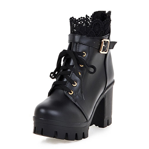 Gdgydh Wholesale Lace Ankle Boots Thick High Heels Women Boots Sexy Lacing Round Toe Platform Ladies Shoes Large Sizes 34-43