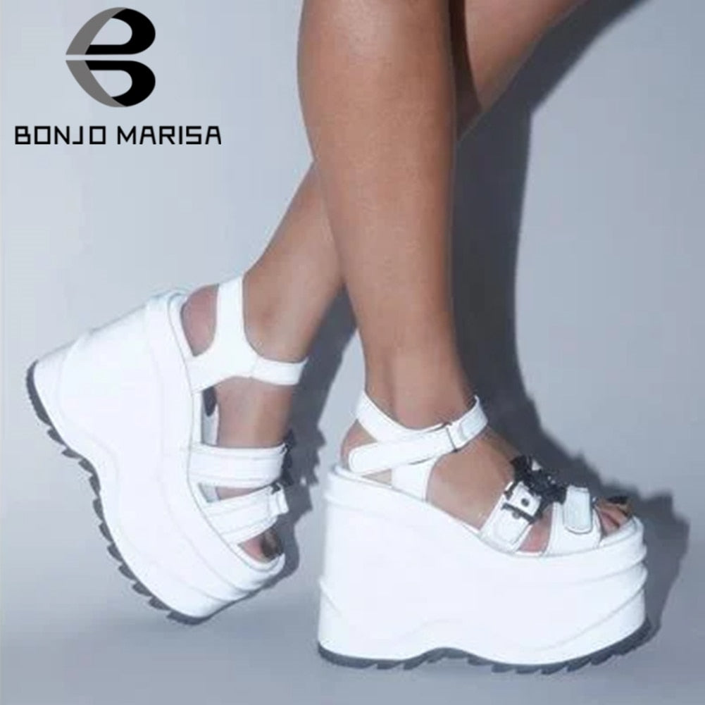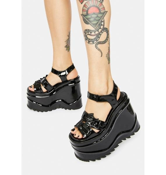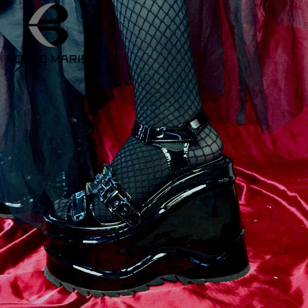 Goth Brand Black Wave 13  Bat Platform Open Toe Wedges Hook Loop Patent Pu Women Sandals 2021 Leisure Casual Punk Sumemer Shoes