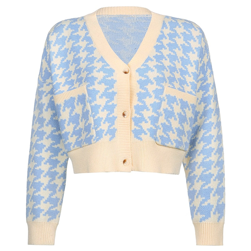HEYounGIRL Houndstooth Plaid Print Cardigan Women Autumn V Neck Vintage Knitted Crop Top Sweater Casual Loose Knitwear Winter