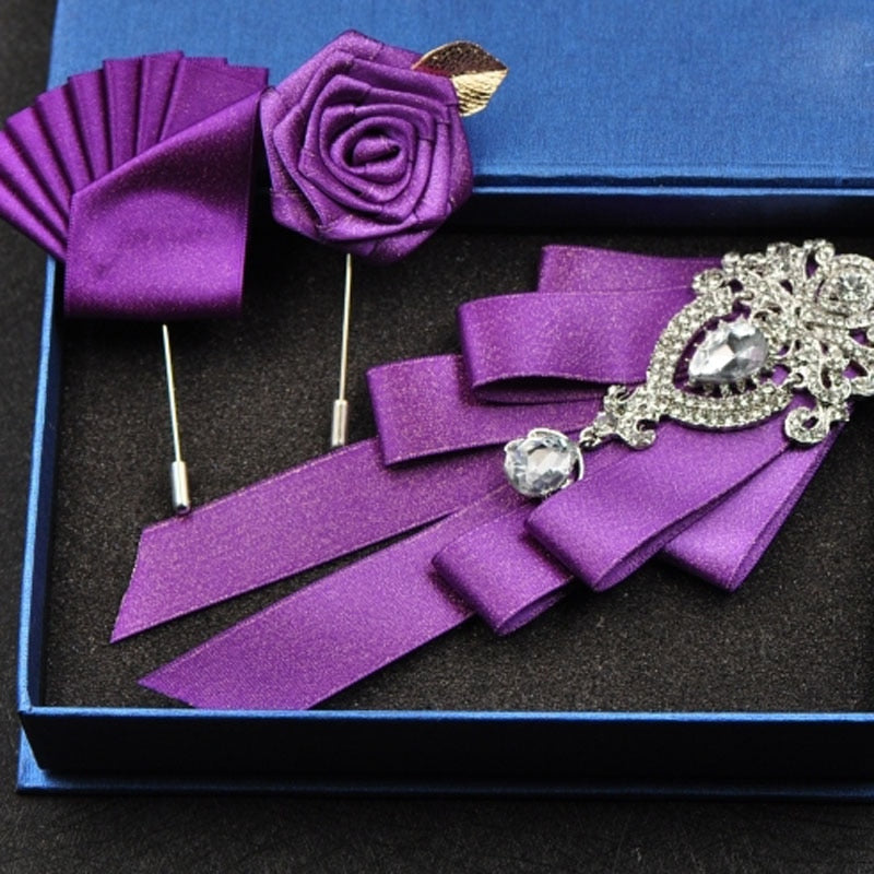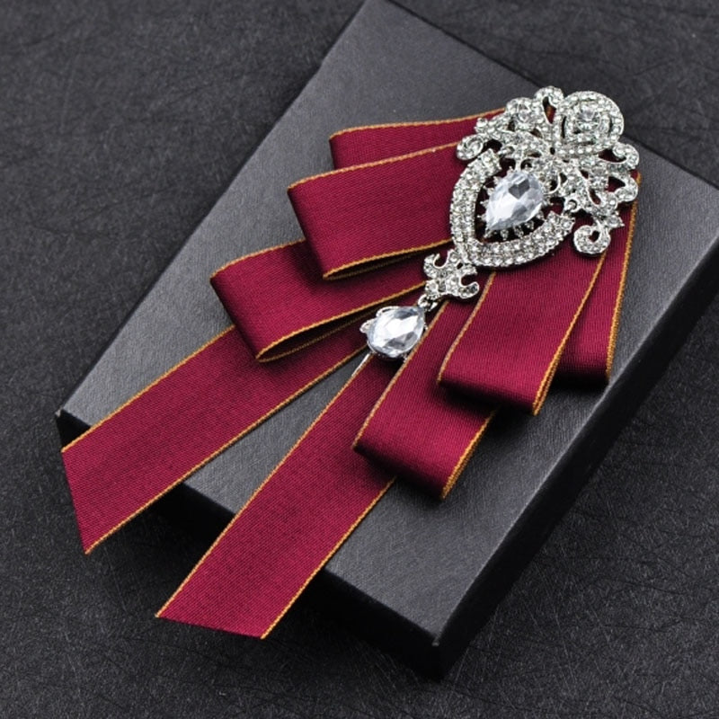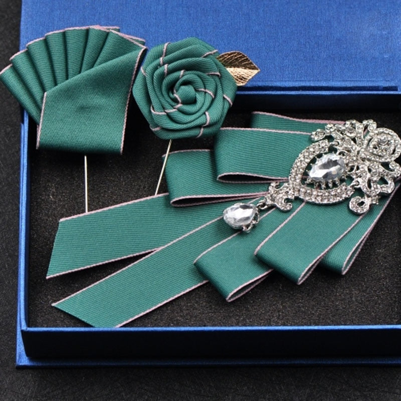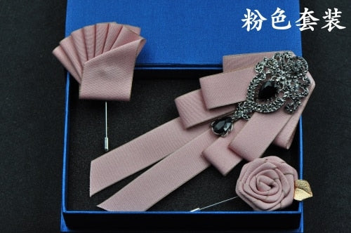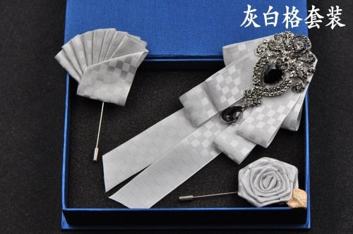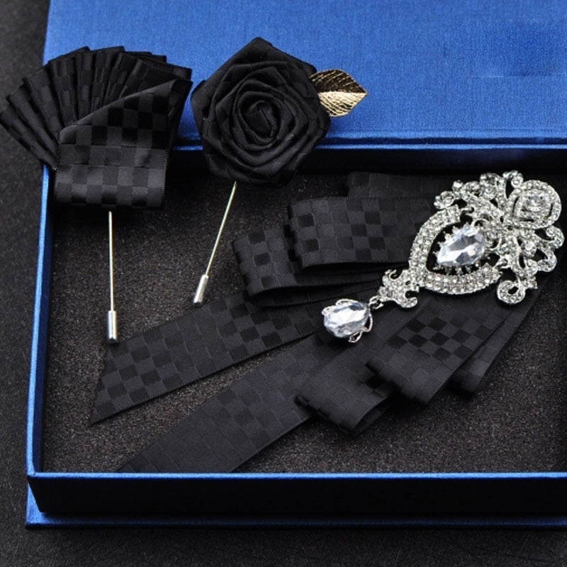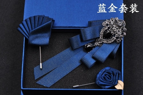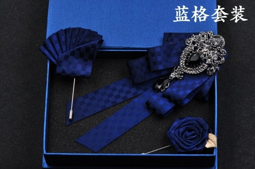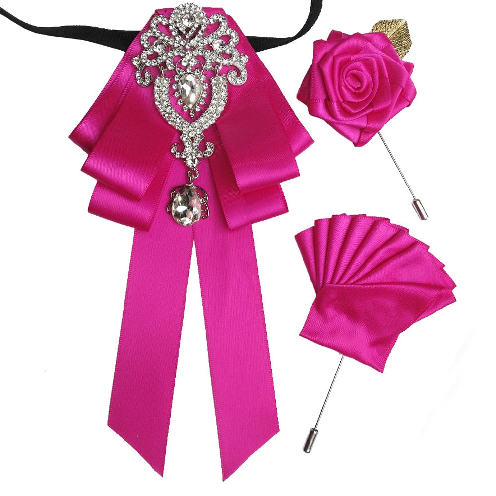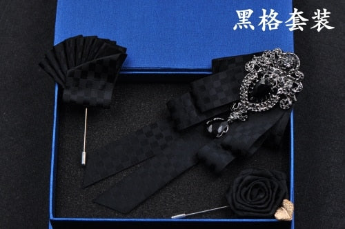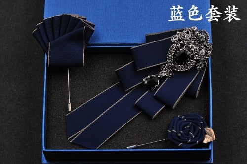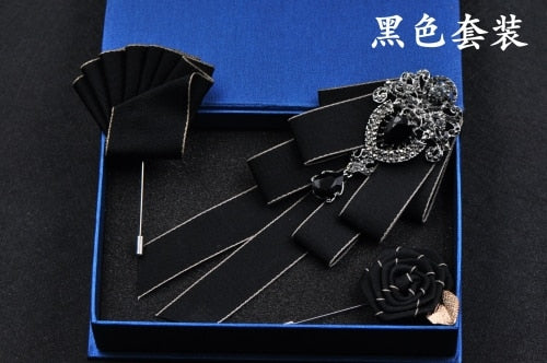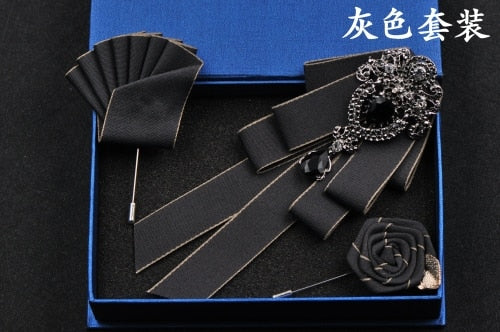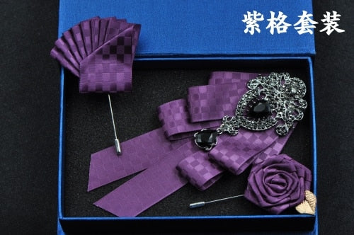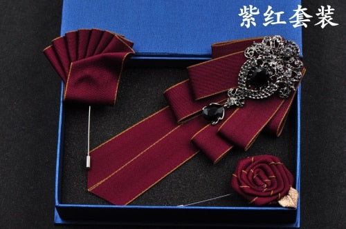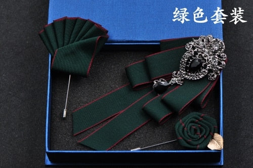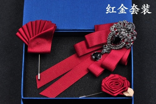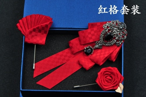 High-quality Fashion Handmade Red Diamond Bow Tie Wedding Collar Bowtie Brooch Pocket Towel Square Set Gifts for Men Accessories