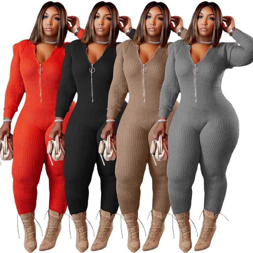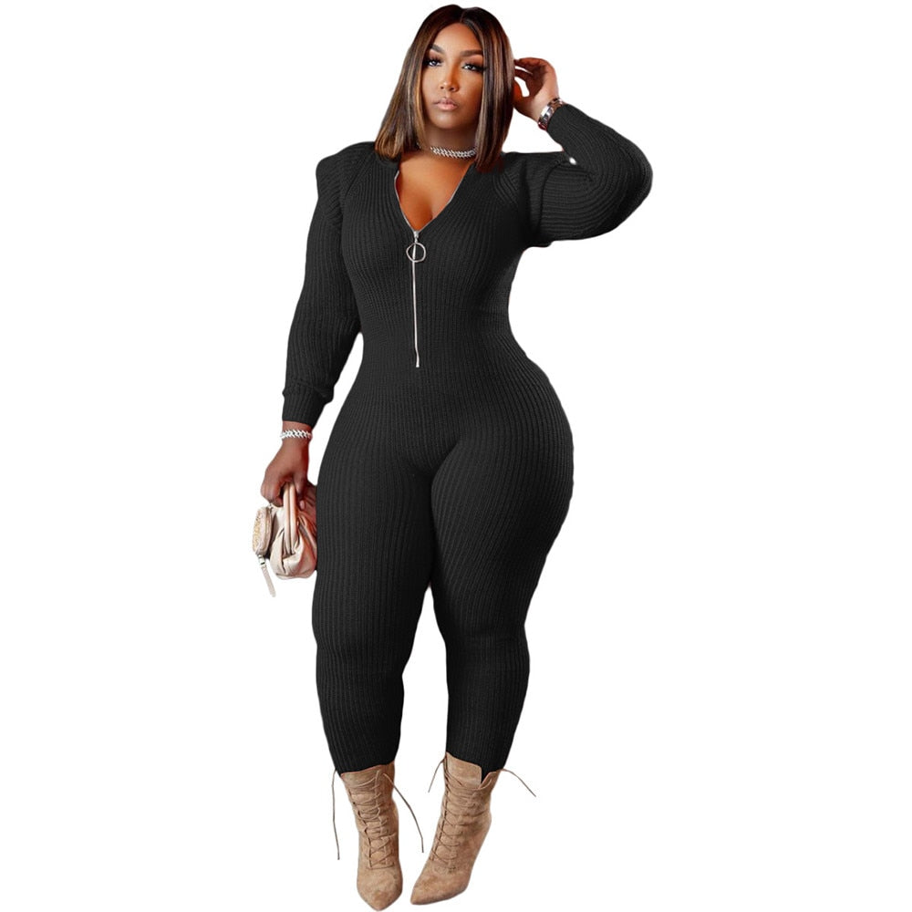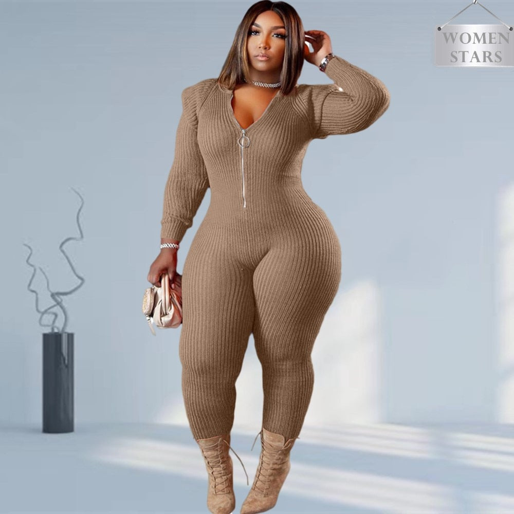 Knitted Jumpsuit Women 4xl Plus Size One Piece Outfit Hoodies Zip Up Bodycon Fashion Street Bodysuit New Wholesale Dropshipping