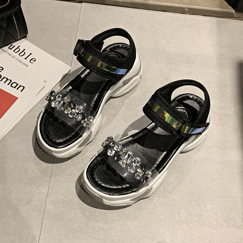 Lucyever 2020 New Women Wedges Rhinestone Sandals Fashion Ladies Platform Ankle Strap Crystal Summer Shoes Woman Black White