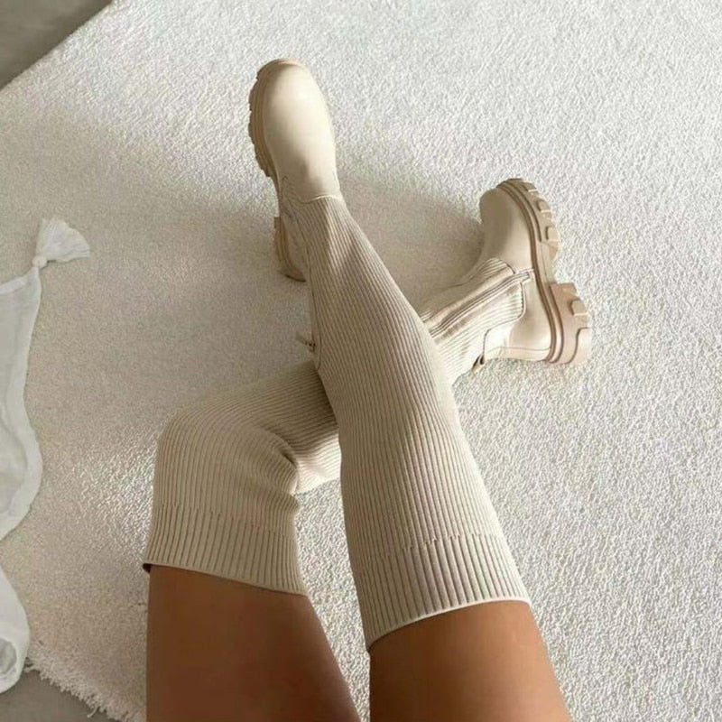 Lucyever 2021 Autumn Platform Over The Knee Boots Women Patchwork Knitting Thick Bottom Long Boots Woman Black Beige Booties