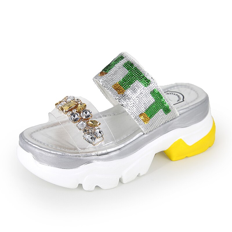 Lucyever New Summer Sandals Fashion Crystal Flat Heels Shoes Slingback Ladies Platform Shoes Woman Rhinestoe Beach Slides 2020