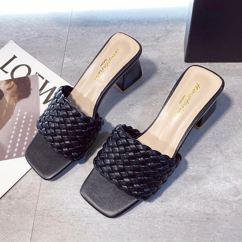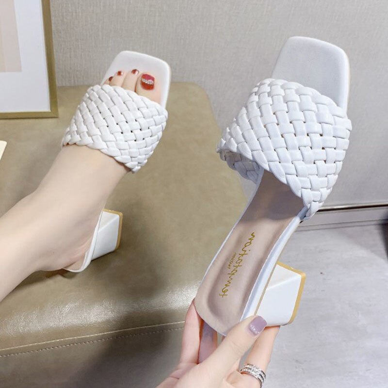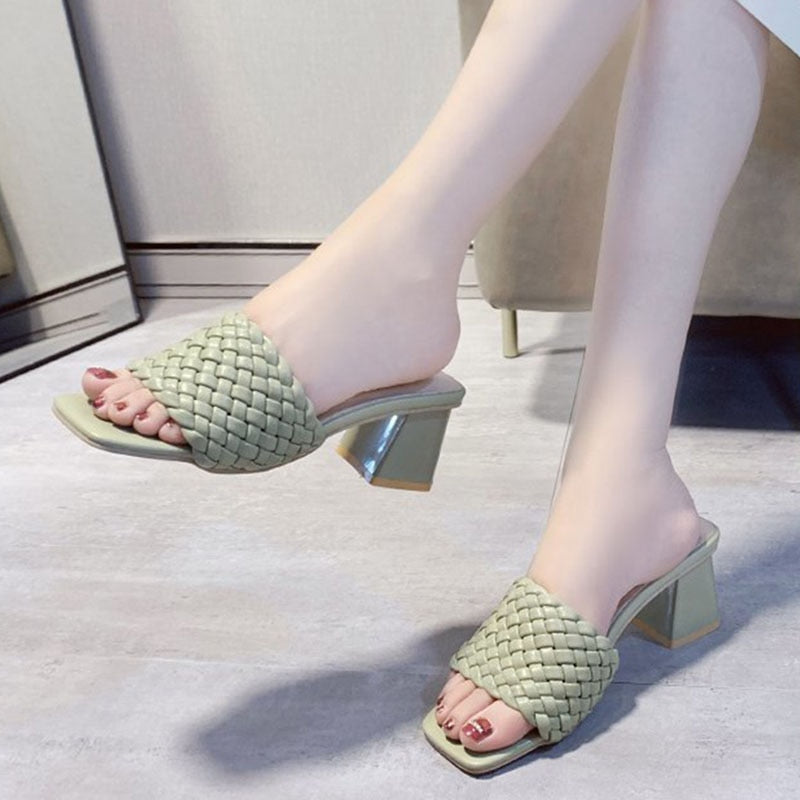 Lucyever Summer Outdoor High Heel Slippers Women Fashion Thick Heels Weave Slides Woman Square Toe Open Toe Sexy High Heels