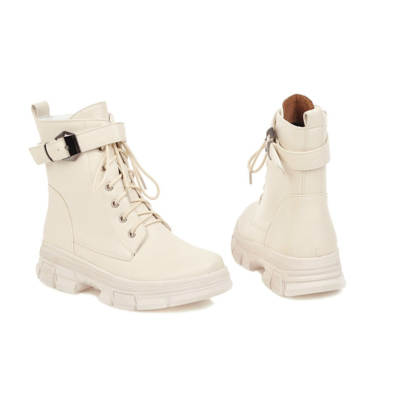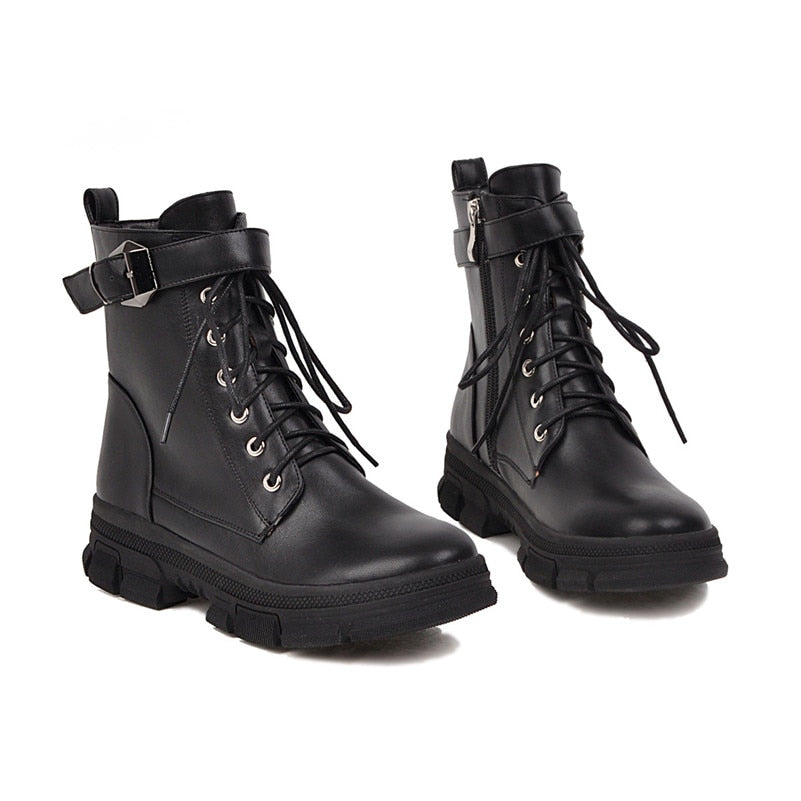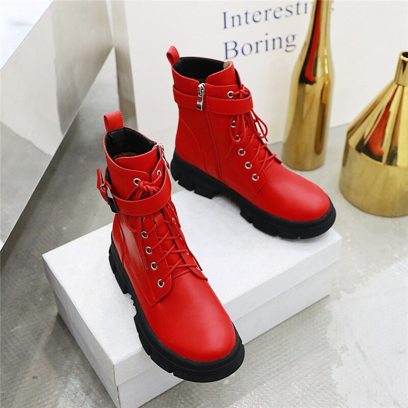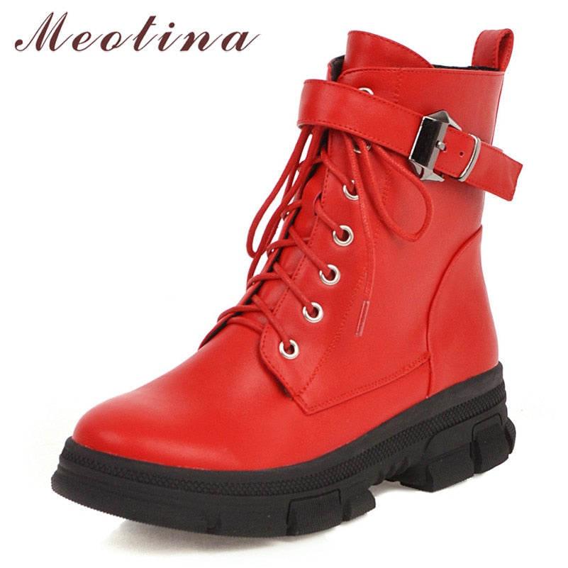 Meotina Winter Motorcycle Boots Women Buckle Flat Platform Ankle Boots Zipper Round Toe Shoes Ladies Autumn Red Plus Size 34-43