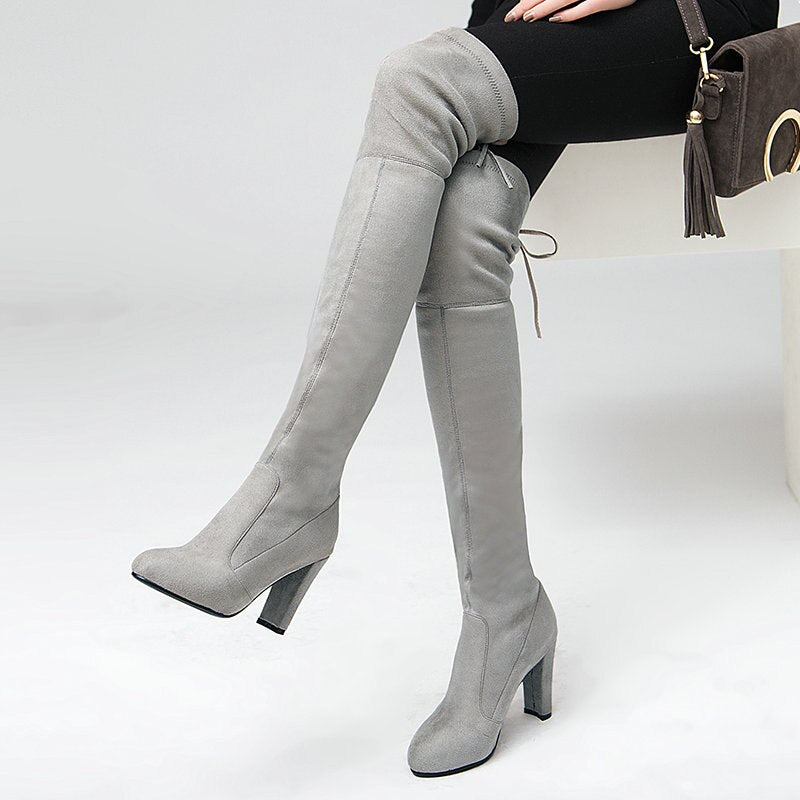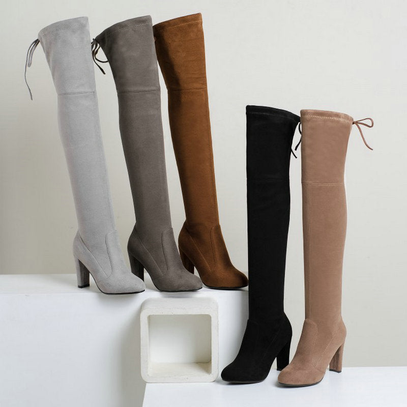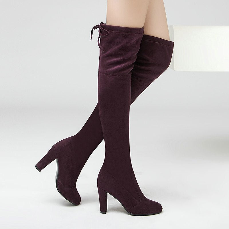 NEMAONE Women Stretch Faux Suede Thigh High Boots Sexy Fashion Over the Knee Boots High Heels Woman Shoes Black Gray Winered