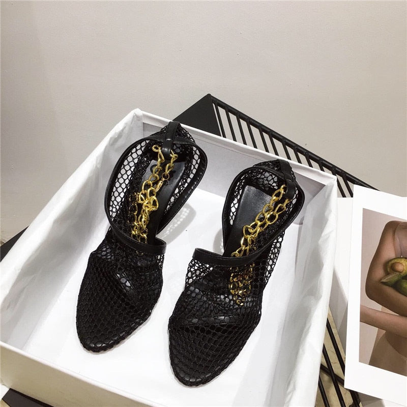 New designer lace air mesh Women Pumps Fashion hollow out shallow chain High heels Elegant Summer Office Ladies Shoes 35-42