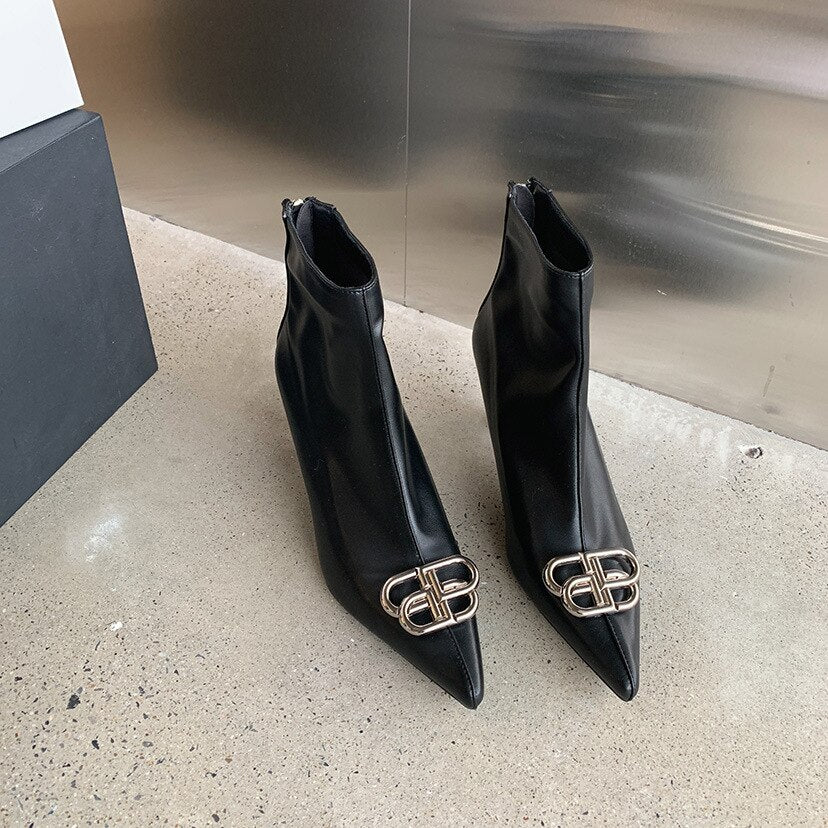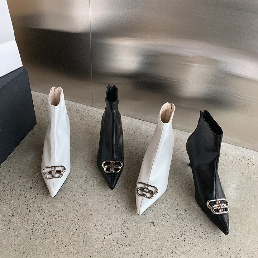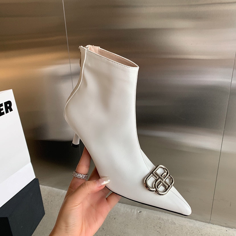 Pointed High Heel Women's White Short Boots 2021 Autumn Female Stiletto Metal Buckle Riding Boots Winter Ladies Thin Single Boot