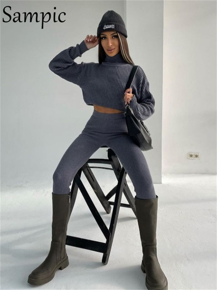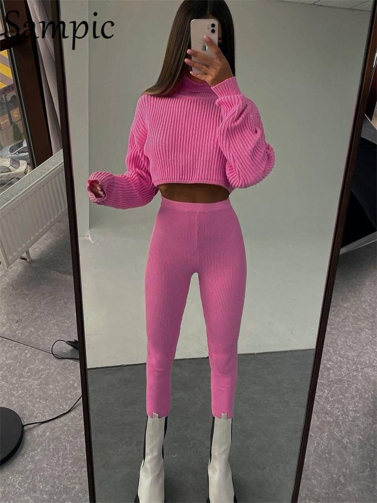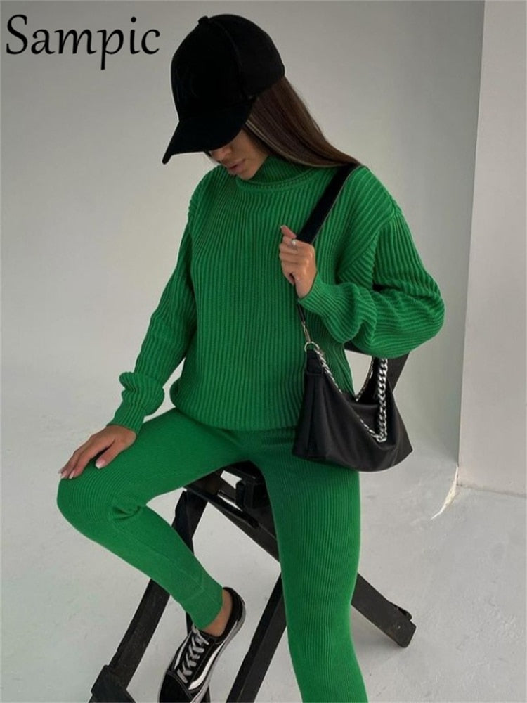 Sampic Casual Pants Suit Women Tracksuit Winter 2021 Pullover Knitted Sweater Tops And Skinny Leggings Pants Two Piece Set