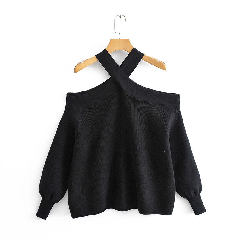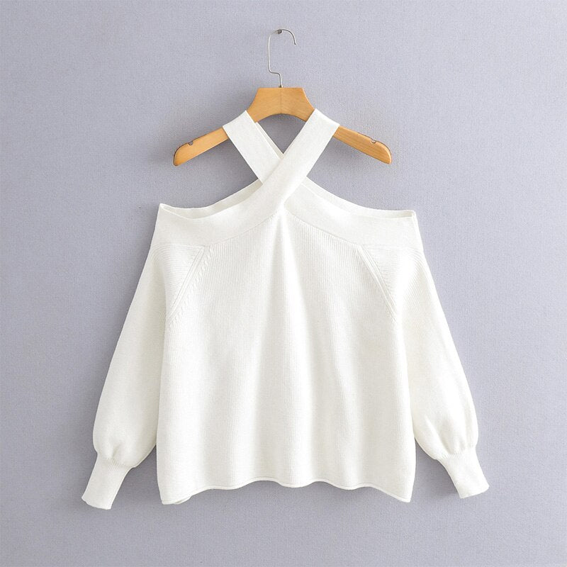 Spring and autumn female casual solid color sweater hanging neck strapless loose sweater