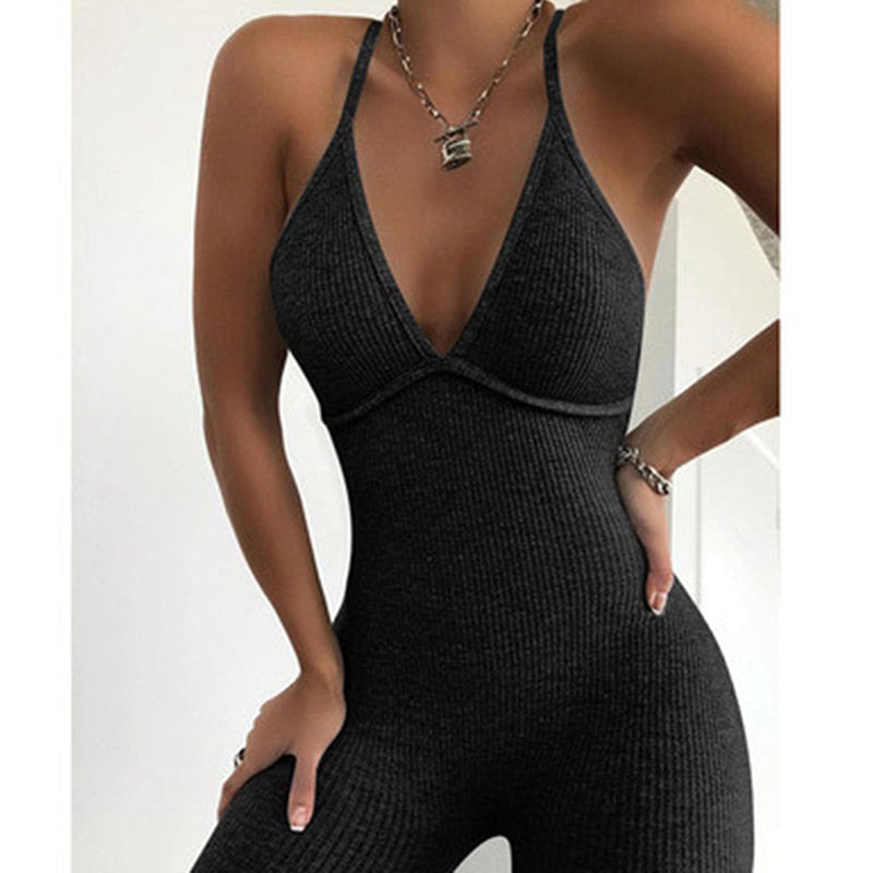 Summer Casual Sport Fitness Streetwear Female Jumpsuit Sexy V Neck Backless Skinny Elastic Jumpsuit Women Outfit
