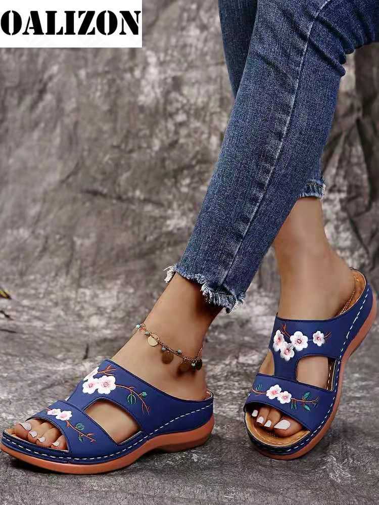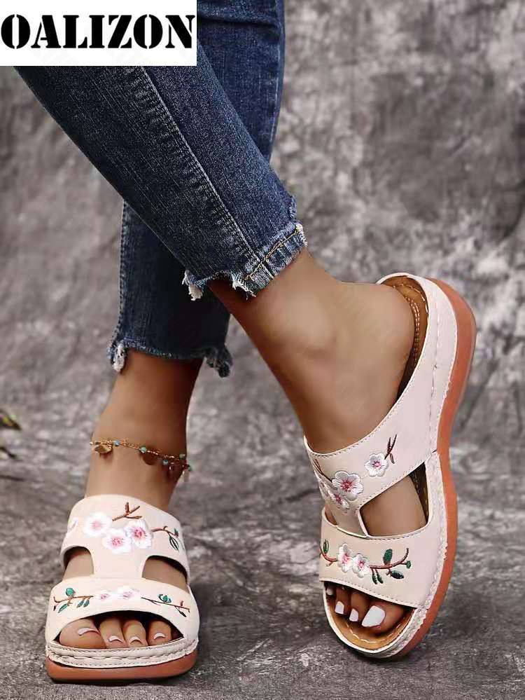 Summer Fashion Embroidered Women Peep Toe Slippers Stitching Shoes Woman Mid Wedge Platform Casual Flip Flops Sandals Lady Shoes