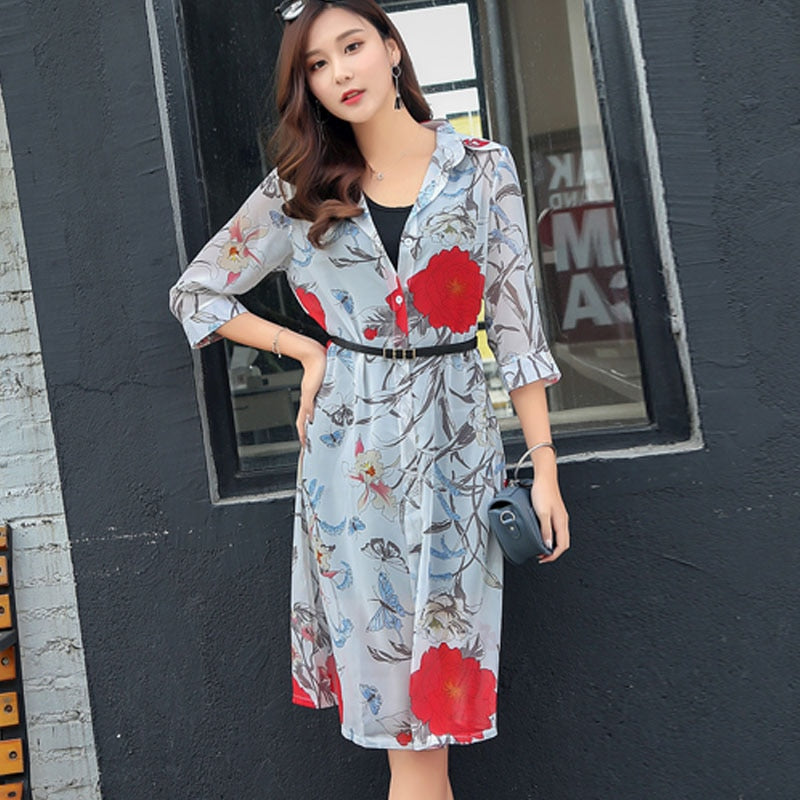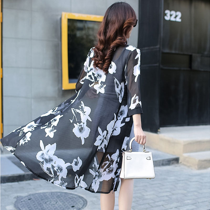 Summer Sun Protection Women Long Blouses Super Thin Floral Chiffon Cardigan Half Sleeve Loose Flower Print Blouse Shirts 4152